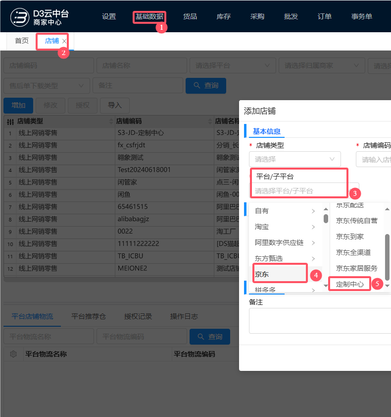 1. 登录D3系统,依次点击【基础数据】-【店铺】-【增加】选项,在弹出的添加店铺界面中选择京东平台下的定制中心,填写相关信息,点击确认即可新建店铺;