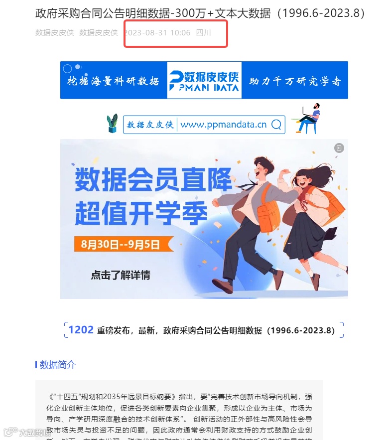 1)政府采购合同是我们很久以前就开始做的数据,在政府采购网爬取了数个月才于2023年8月31日发布(详见),贵公司的发布时间为2023年10月8日,且时间跨度多一个月