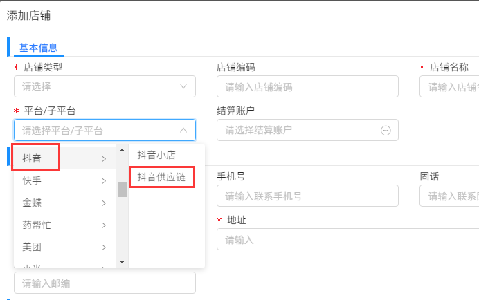 1. 登录D3系统,依次点击【基础数据】-【店铺】-【增加】选项,在弹出的添加店铺界面中选择抖音平台下的抖音供应链,填写相关信息,点击确认即可新建店铺;
