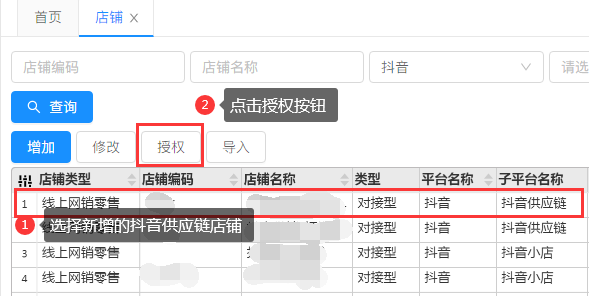2.选择建好的抖音供应链店铺,点击上方的授权按钮,在弹出的页面中登录授权的店铺,完成授权步骤后返回系统中点击授权完成,设置好订单同步、物流匹配等相关策略就可开始使用啦。