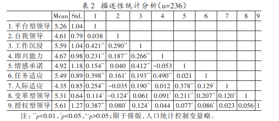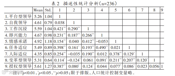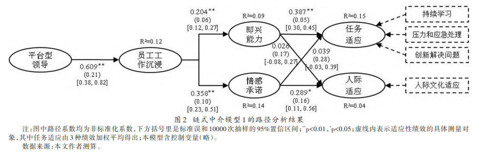 考虑到前文提及的工作沉浸与情感承诺可能存在相互影响关系(里贝罗等,2021),便将情感承诺对工作沉浸的反向影响纳入计量,进行了模型的稳健性检验。将两个变量位置互换后,重新计算模型2的拟合效果,主要指标为 χ2 /df=2.760,RMSEA=0.081,GFI=0.935,CFI=0.941,NNFI=0.923等,拟合度未有大的变化。不过用Mplus进行路径检验发现,平台型领导对情感承诺的直接效应微弱,β=0.068(p0.10,[-0.08,0.11],不显著)。也就是说,以情感承诺为链式效应的前段中介的情形是不成立的。 而且情感承诺对即兴能力的影响也不显著,β=-0.085(p>0.10,[-0.23,0.09]),可知情感承诺是无法充当赋能员工的关键刺激点的。至此,平台型领导基于工作沉浸的链式中介模型假设得到了再次验证。