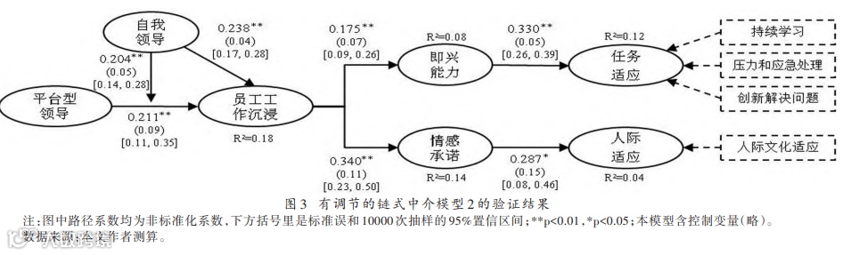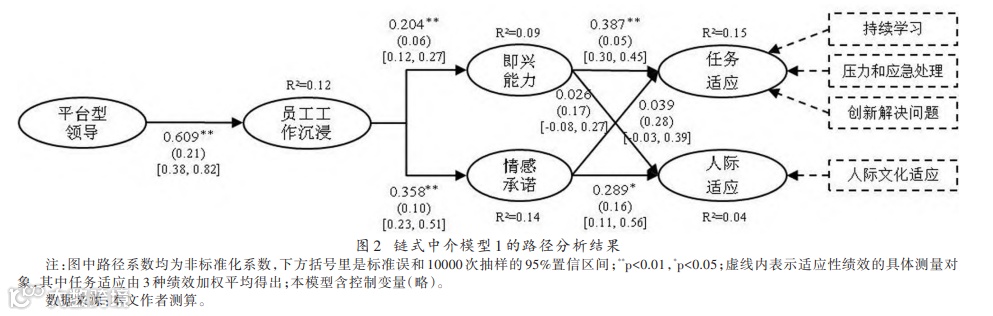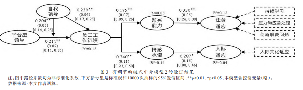 检验各条中介路径。首先是平台型领导通过工作沉浸对即兴能力的影响路径,通过两阶段直接效应系数相乘的方法计算出该路径系数为0.124(SE=0.06,p<0.05),置信区间为[0.05,0.19];其次是平台型领导通过工作沉浸对情感承诺的影响路径,同样计算出β=0.218,SE=0.09,p<0.01,置信区间为[0.11,0.35];上述结果的置信区间均不包含0,支持了假设3a和3b。最后是链式中介效应。两条路径的三阶段系数相乘得出:通过即兴能力的路径系数为0.048(SE=0.03,p<0.05),置信区间为[0.007,0.09];通过情感承诺的路径系数为0.06(SE=0.03,p<0.05),置信区间为[0.01,0.12]。以上结果支持了假设1和假设2。