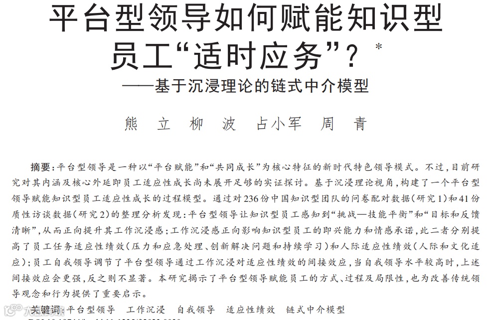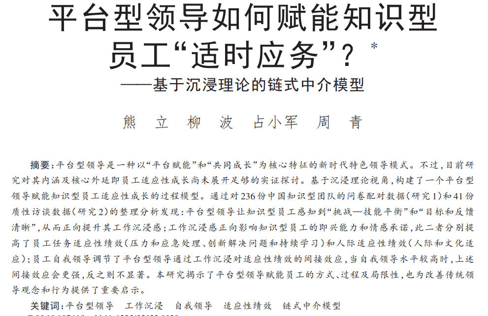熊立,柳波,占小军等.平台型领导如何赋能知识型员工“适时应务”?——基于沉浸理论的链式中介模型[J].管理世界,2023,39(02):124-140+223+141.