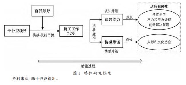在平台型领导以兴趣、成就、交互、给予为主导思想的管理模式下,员工工作沉浸发挥出“承前启后”的纽带作用,其因“挑战—技能平衡”而生,接着赋能员工认知和情感上的升级,然后分别影响其人际和任务的适应性绩效。于是,本文提出以下假设。