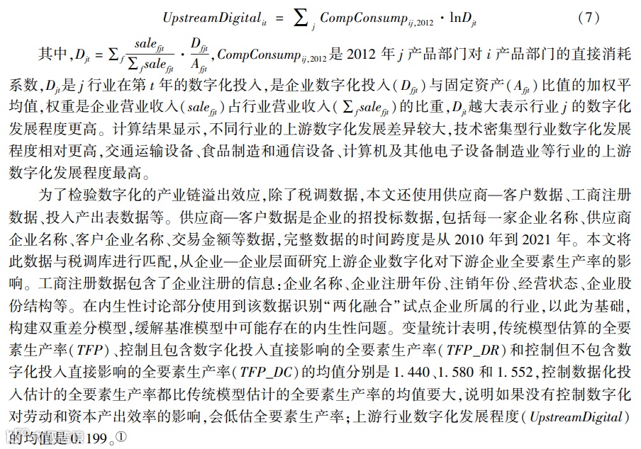 3.1变量构建与描述统计参考Luetal.(2017),根据投入产出表,计算上游行业数字化发展指标(UpstreamDigitalit),是上游各行业平均数字化发展程度的加权平均值,具体计算公式如式(7):