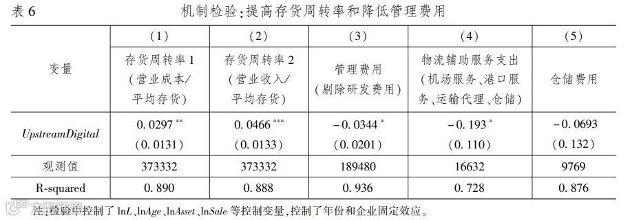 本文认为,一方面,下游企业通过学习上游企业的经验,优化管理方式;另一方面,上游数字化为下游企业提供更丰富的供销信息、更优质和稳定的中间品和服务,降低下游企业搜寻成本、库存量和仓储成本,提高下游企业的库存周转率和管理费用。