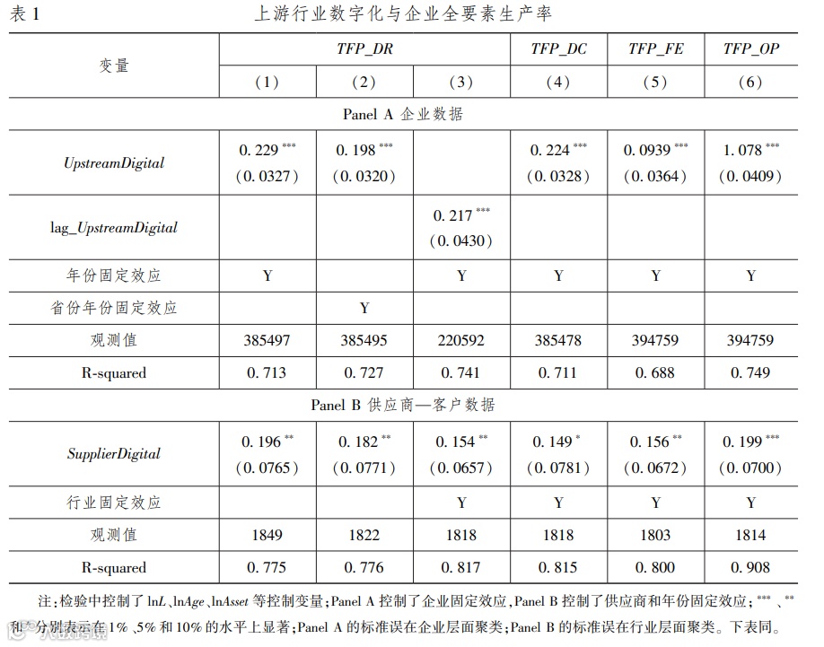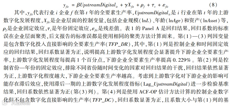 【摘要】高质量发展要求中国经济逐步从要素投入型向全要素生产率推动型增长模式转型,要实现这一目标,数字经济发展可能是未来一个潜在的突破口。本文将为这一判断提供初步的微观证据。本文将企业数字化投入纳入传统增长核算模型,发现数字化投入的产出弹性为0.07-0.09,且行业间差别大,配置效率提升空间较大;平均而言,数字化对企业全要素生产率的影响程度为10%左右。此外,行业—企业、企业—企业匹配数据检验结果均表明,上游的数字化发展存在产业链溢出效应,会使得下游企业管理费用下降、存货周转率提高,同时优化下游行业的资源配置效率,提升下游企业整体的生产率水平。本文的研究表明,当绝对的技术突破面临瓶颈和不确定性时,通过数字经济的发展优化资源配置,进而提高全要素生产率,也许是中国经济实现稳定增长的路径之一。