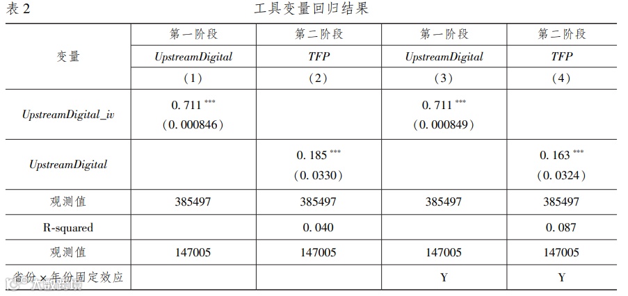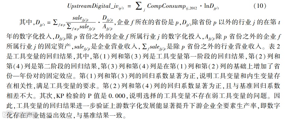为了缓解内生性,本文使用两种方法:一是构建工具变量,检验基准结果的稳健性;二是根 据“两化融合”管理体系贯标的政策试点改革,构建连续的双重差分模型,进一步检验基准 结果。首先,参考Bartik IV方法,构建上游数字化发展程度的工具变量,使用工具变量回归模型检验基准结果。企业i的上游数字化发展程度的工具变量是除i 所在省份之外的上游行业的加权数字化发展程度,具体如式(10):