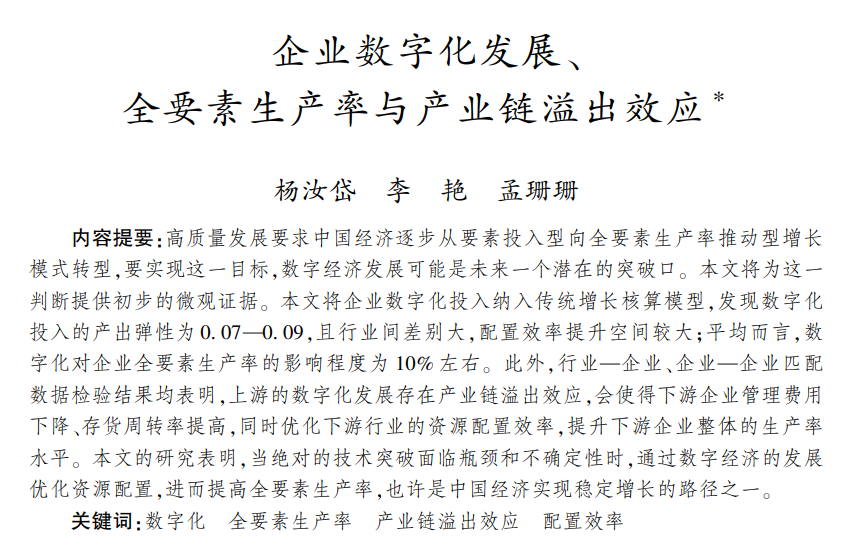 不久前,北大、清华经济学院杨汝岱、李艳和孟珊珊合作论文“企业数字化发展、全要素生产率与产业链溢出效应”在顶级学术期刊《经济研究》上发表。文章重点考察了数字化对企业全要素生产率的影响。