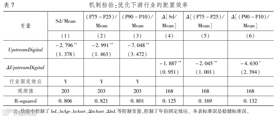 行业内存活下来的企业规模扩张同样是资源配置效率改善的一种表现。上游行业数字化转型会提高生产的产品质量,较高质量的中间品有利于下游行业生产和扩大规模,规模扩张带 来规模经济。企业在规模扩大后也更愿意优化管理方式、开展研发和创新活动等,进而提高下游企业全要素生产率。