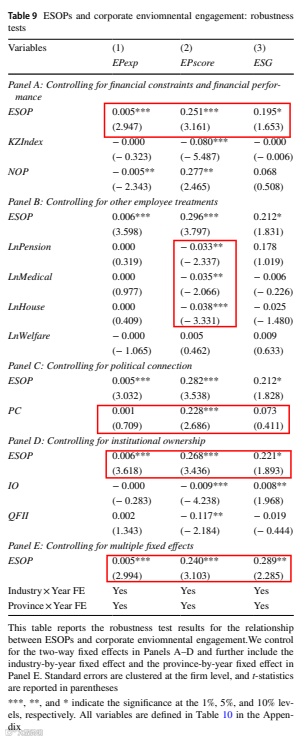 政府对企业部门实施的针对特定地区或特定行业的环境保护政策可能影响了企业的环境参与。因此,企业环保活动很可能集中在某些领域或行业。为确保员工持股计划与企业环境参与之间的正相关关系不受时变行业或区域特征的驱动,我们在基线模型中纳入了行业逐年固定效应和逐省固定效应。结果报告在表9的面板E中,显示ESOP的系数在所有列中都保持正值和显著,证实了我们的主要发现。