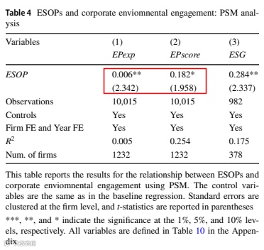 然而,尽管参与员工持股计划的员工在施加压力以改善工作环境和降低企业风险方面具有强烈的共同利益,从而产生更高的长期市场估值,但他们的努力可能会受到搭便车员工的影响(Kim & Ouimet, 2014)。然而,员工持股计划(ESOP)所创造的激励措施可以通过使员工面临同伴压力和共同监督来克服搭便车的约束(Kandel&Lazear, 1992)。因此,当员工要求企业进行环境保护时,员工持股计划会通过把成员聚集在一个有共同利益的团体中来增强他们的集体谈判能力,从而有力地激励他们推动公司更加环保。