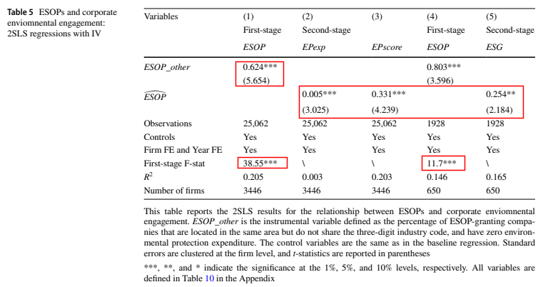 我们采用位于同一地区但不共享三位数行业代码作为工具变量的所有公司的 ESOP 实践。为确保工具变量满足排除标准,我们仅纳入其他行业环保支出为零的公司,以避免当地环境冲击的影响(如当地环境政策)和行业内企业环境参与的相似性(例如一个区域内企业环境投资的行业对等效应)。我们按如下方式执行 2SLS 回归: