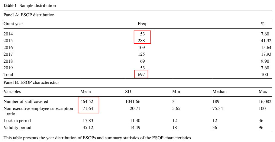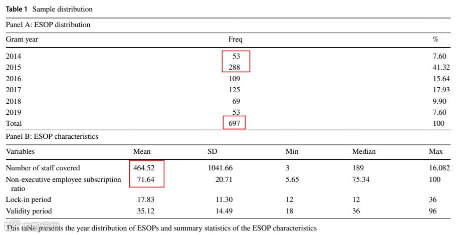表 1 的面板 A 显示了 ESOP 的年度分布情况。2014 年授予的员工持股计划数量为 53 个,2015 年激增至 288 个。在我们的样本期间,公司共授予了 697 个 ESOP。尽管 ESOP 参与者包括非执行员工和管理层,但他们广泛分布在员工身上。表1的面板B显示:平均参与人数为465人,非执行员工平均认购员工持股计划股份的71.64%。