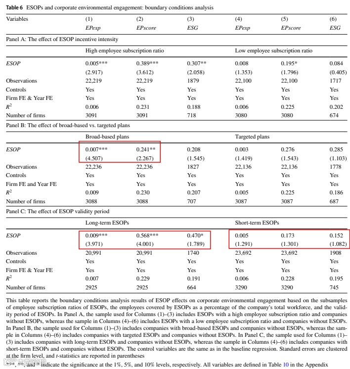 本研究首次探讨了向非执行员工授予员工持股计划是否会影响企业环境参与度。通过对2009年至2019年3450家中国上市公司的25,066个公司年度观察样本的分析,我们发现,通过环境保护支出、环境信息披露质量和ESG评级来衡量,ESOP的采用与企业环境参与之间存在显著的正相关关系。员工持股计划将员工薪酬与公司未来的股价挂钩,从而通过员工对更好的工作环境、更低的企业风险和卓越的长期市场价值的要求来促进企业环境参与。这些结果表明,员工持股计划增强了员工向公司施加压力以对环境负责的意愿和能力,揭示了他们作为有影响力的利益相关者群体所发挥的重要作用。我们进一步研究了员工持股计划影响企业环境参与的边界条件,发现员工持股计划对高强度、广泛性、长期性计划的影响更强,其激励效果显著增强。这一发现也支持了员工持股计划通过提供员工激励措施来促进更好的环境绩效的假设。此外,对于面临激烈劳动力市场竞争和媒体曝光率较高的公司,以及污染严重的行业的公司,观察到的正相关关系更为明显。这些发现表明,由于员工代表的强度不同,员工持股计划对企业环境参与的积极影响因公司而异。由于参与员工持股计划的员工对管理层施加压力,要求他们对环境负责,因此,当他们拥有更大的议价能力时,或者当管理层因媒体的密集曝光和更严格的公众监督而不得不满足员工的要求时,压力会更大。