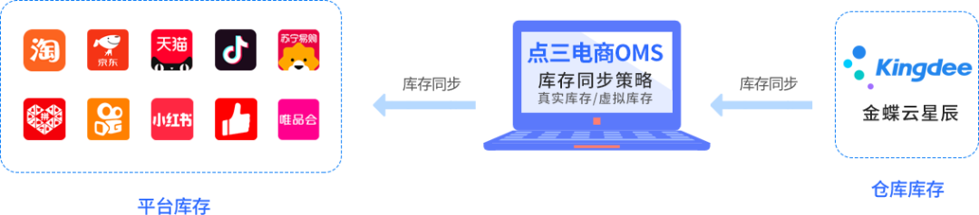 点三电商OMS强大的集成连通能力,打通金蝶云星辰与电商平台的信息通路,共同形成针对中小微商贸流通企业的全渠道解决方案。点三电商OMS目前已对接60+电商平台,专注于电商订单统一处理、商品库存自动同步、电子面单管理等,与星辰协同帮助企业实现从营销前台到财税中后台的集中管控,赋能企业快速发展。