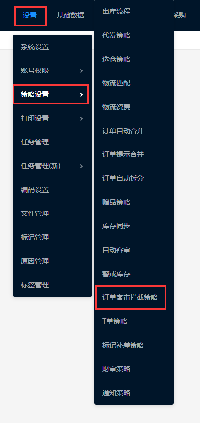 选择设置 - 策略设置 - 订单客审拦截策略