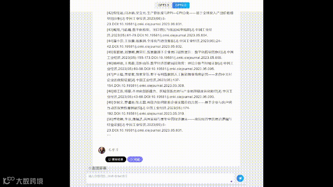 目前皮皮侠学术GPT引擎分为3.5/4.0版本,3.5版本输出速度更快、内容较为丰富,适合大多数使用者,而4.0融入更多的学术逻辑与性能升级,在输出内容上更加优质,更贴合学者的学术需求!(以下是使用演示)