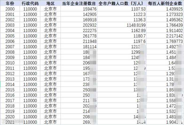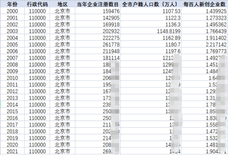 现有文献主要采用生态学研究法、劳动力市场法以及人口法刻画创业活跃度。为此,我们整理了各城市20年所有类型新创企业数的面板数据,为了克服城市规模的影响,计算得到了城市每百人新创企业数。该指标可以作为城市创业活跃度的测度指标,读者可以使用本数据开展城市创新创业方向的研究。