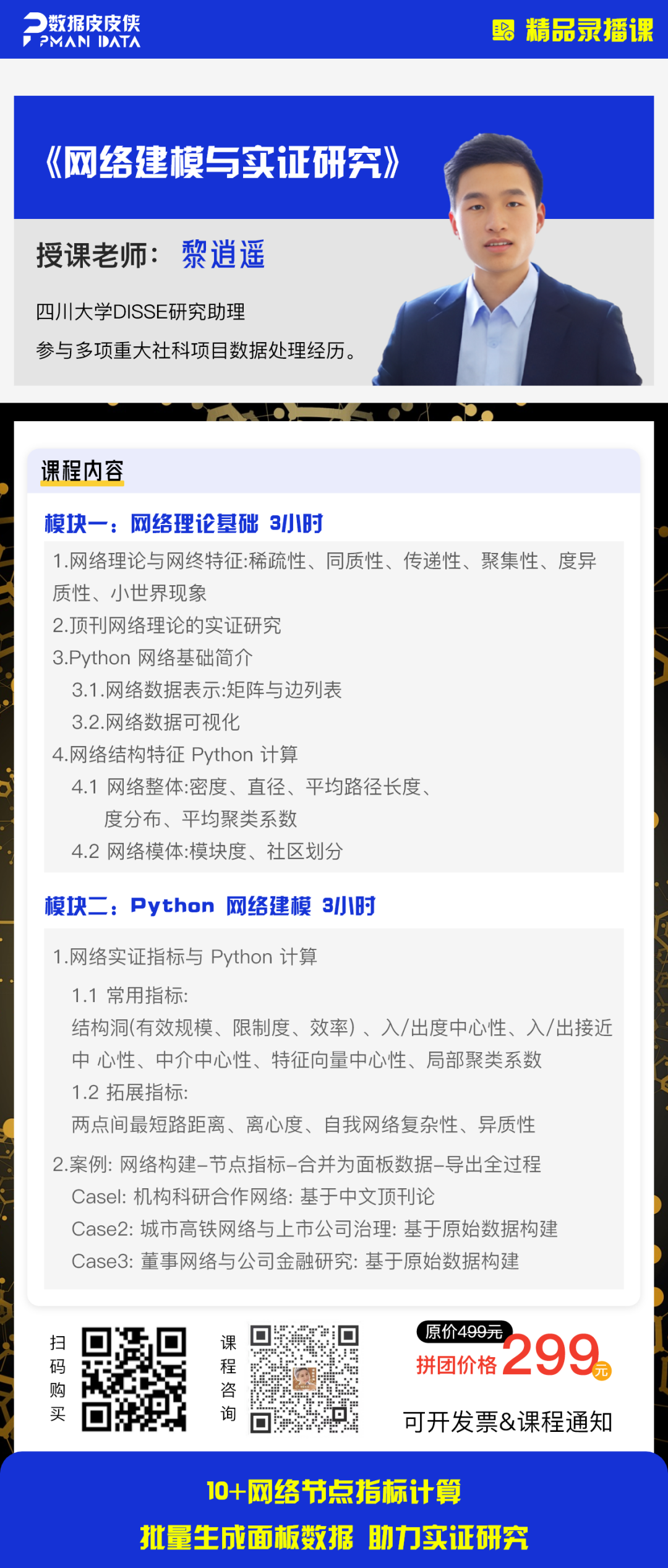 网络在社科研究中起着重要作用,不同网络的网络结构特征对国家、城市、公司、个体产生方方面面影响,使用网络的概念,从网络的角度理解社科问题,已经成为社科实证研究的的一门新手段、新时尚,掌握网络建模方法将大大扩展社科实证研究空间。为此我们专门开发了《网络建模与实证研究》,通过解析网络结构指标含义及经管应用,从原始数据构建网络并自动生成面板数据,帮助大家掌握该研究方法。