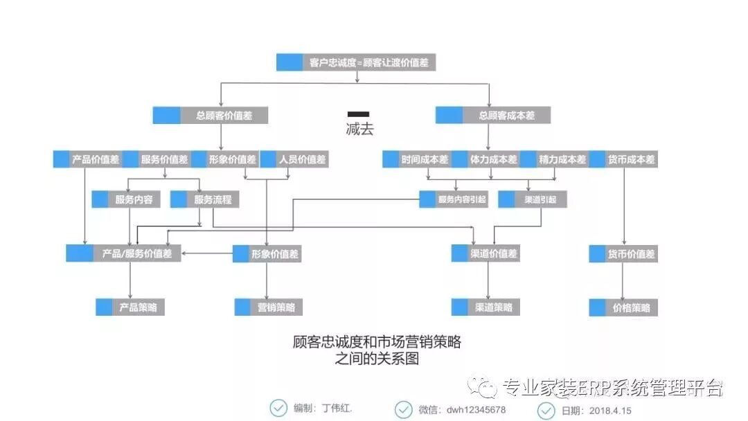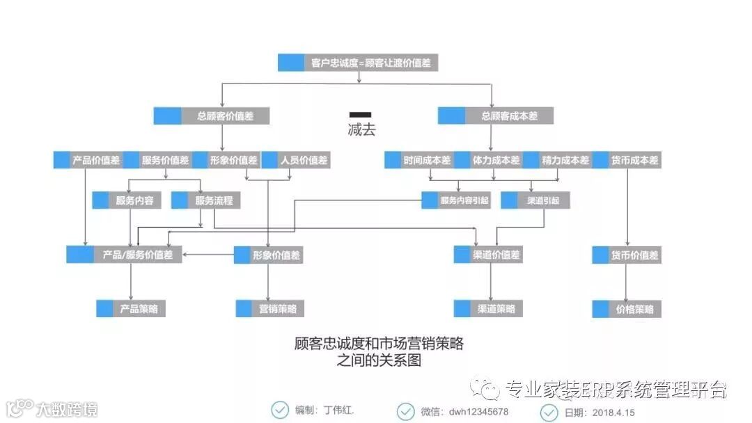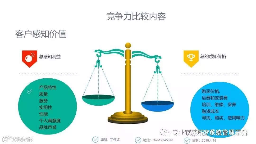 这是另外一个客户因何购买的理论,我个人觉得理解起来比较简单,操作起来也不难。客户感知价值理论,首先应该站在顾客的角度来看待产品和服务的价值,这种价值不是由公司决定的, 而是由顾客实际感知到的,顾客所得到的收益总和减去其在获取产品和服务时所付出的成本决定的。从某种意义来说,通过竞争分析、改善经营方式, 向目标顾客提供超越竞争对手的价值, 而顾客为了使自己获得的感知价值最大, 也更加乐于和公司维持互动的关系,这点非常重要,也就是我们都想做的粉丝运营的理论基础。基于客户感知价值的家装公司竞争力指标,见图6。