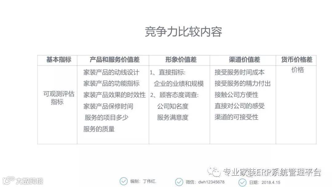 现在想起来这可能是我第一次做竞争力分析了,一晃10年过去了。我当时采用的方式是以客户的视角,进行市场公开询价,了解公司套餐标配材料的市场最低价,然后以100㎡房间为原型做报价,和公司的套餐价格对比。同时,把竞争对手的报价和标配材料,进行像素级对比,结果我们完胜。
