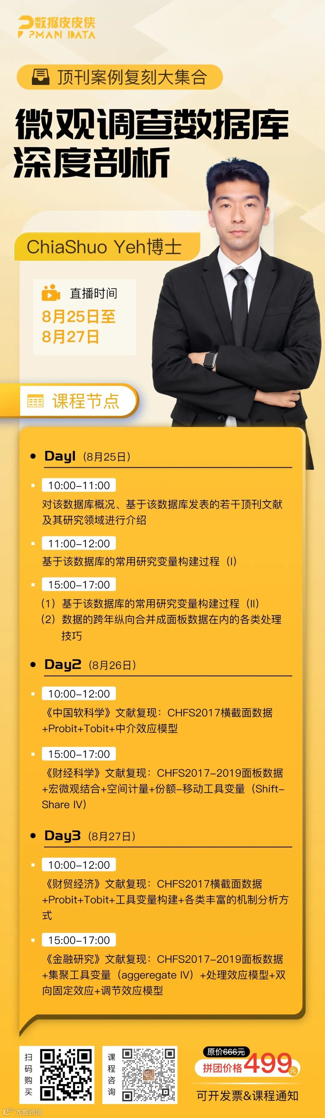 数据皮皮侠的粉丝朋友们,还记得我吗,我是大家最爱的ChiaShuo Yeh博士。作为长期试图混迹经济学领域的科研工作者,我对西南财大中国家庭金融调查CHFS数据库可以说是非常熟悉。据我所知,身边非常多的小伙伴想用这个数据库好好地完成自己的本/硕/博学位论文,或是发够毕业所需的期刊论文,但是时常感觉“入宝山而空回”,没有找到好的方法把它用起来。急大家所急,向来是我的美好品格之一(doge)想到大家为此所困,我就想为大家出出力,经过我最近很长一段时间苦心孤诣的钻研,终于为大家准备了这样的一套课程。