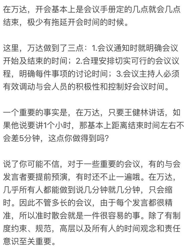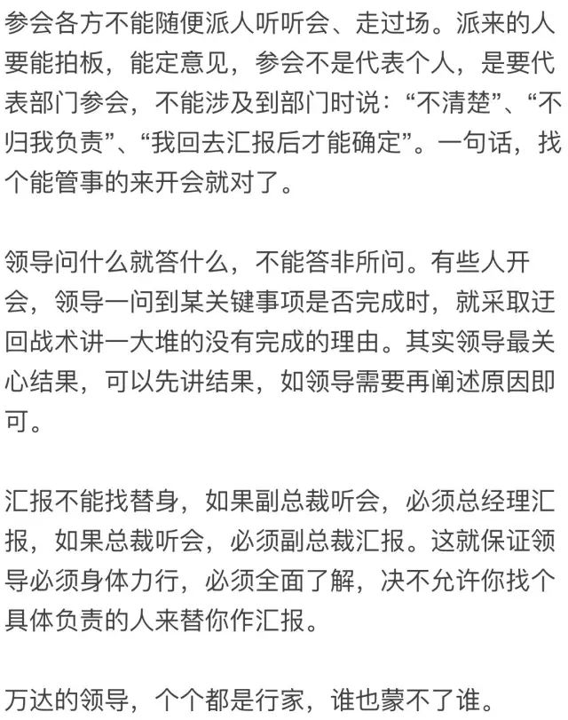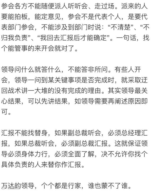 万达的执行力是非常有名的,万达开会也是很有特点的。“万达开会,没人敢睡”,不是说谁怕谁,是怕漏了重要内容,会耽误你的前程。以下都是万达开会的常规做法和原则,不仅落地而且全部实招。