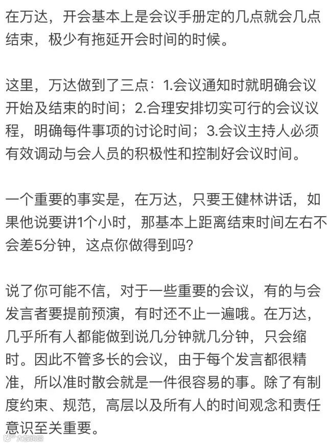 万达开会从来没有空话、废话,开会是要解决问题的,不是来听你唠叨的。因此,万达会场经常会有发言和汇报被打断,因为你跑题了,或者“这个根本用不着跟我汇报”。