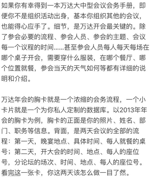 一家企业要来万达全面取经,涉及到管理、财务、人力、管控、信息化、纪检、企业文化等,万达每个板块的一把手每人讲述一刻钟,每人10张PPT,效率之高、干货之干,令那家企业高管们惊叹不已。