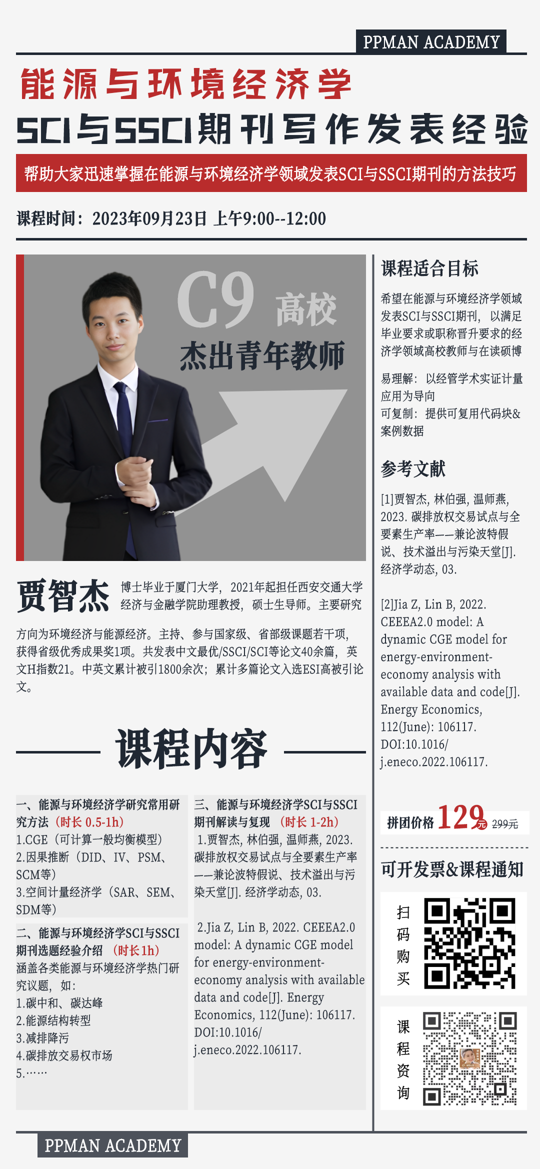 本次课程我们为大家邀请了C9高校杰出青年教师贾智杰老师,为大家讲解能源与环境经济学SCI与SSCI期刊写作发表经验,课程内容涵盖能源与环境经济学研究常用研究方法、能源与环境经济学SCI与SSCI期刊选题经验与由贾智杰老师本人写作并发表的2篇能源与环境经济学SCI与SSCI期刊文献的解读+复现。
