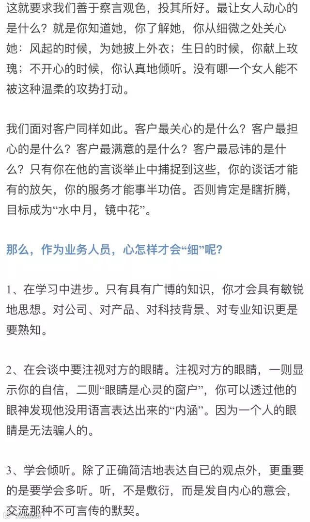 3、要有一种平衡的心态。就正如我们追求心仪的女人,你并不是去求她给你恩赐,而是让她不错过一个能让她幸福的男人;同样,我们面对客户,一定要有这种平衡的心态:客户是重要的,我是同等重要的,我们如果合作,他会为我带来业绩,而我会给他带来创造财富的机遇。