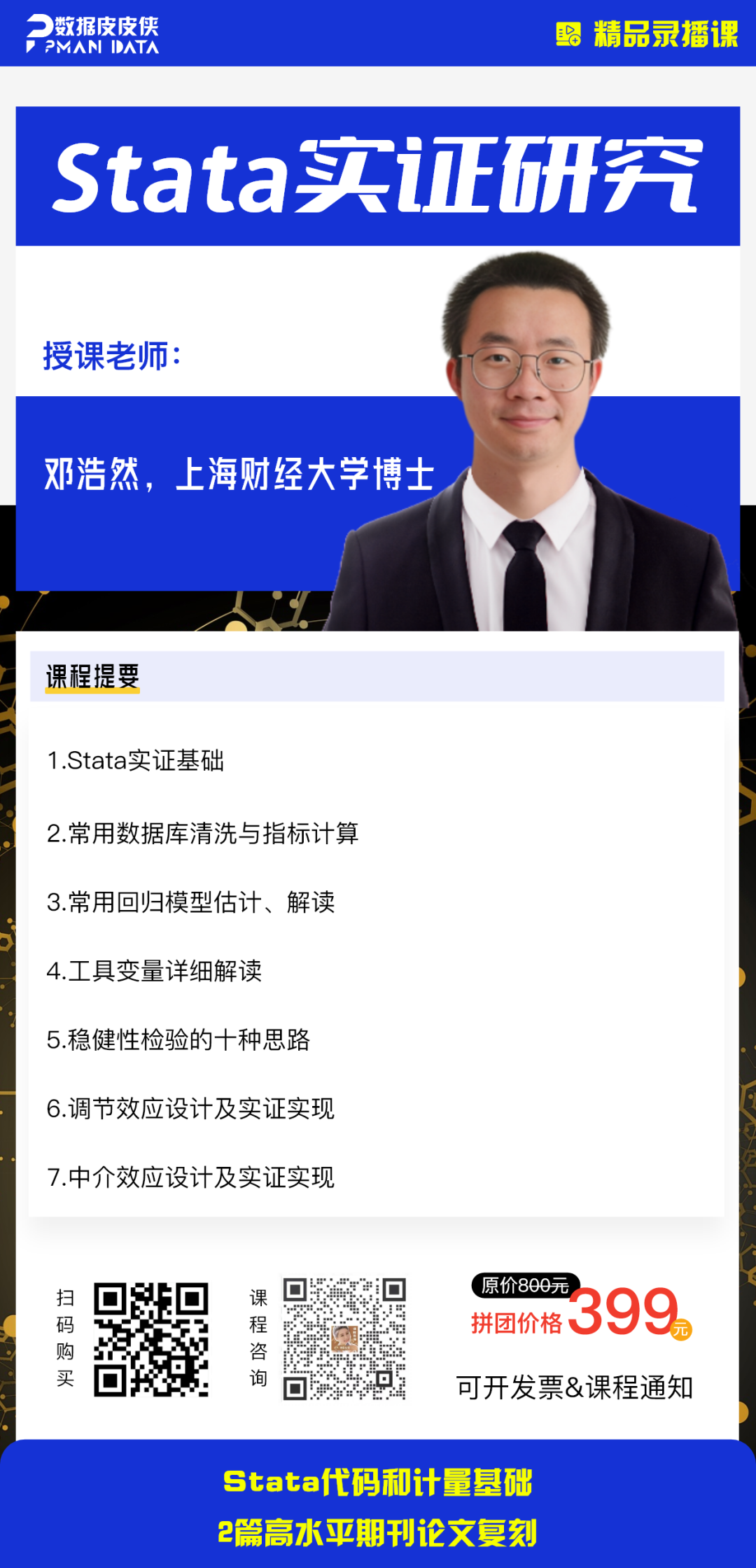 优惠二:集赞优惠,转发本推送到朋友圈2小时(不屏蔽)积赞20;或转发到100人以上年级群,并留言“很棒的实证研究课程”,享受8折优惠,可与优惠一叠加。