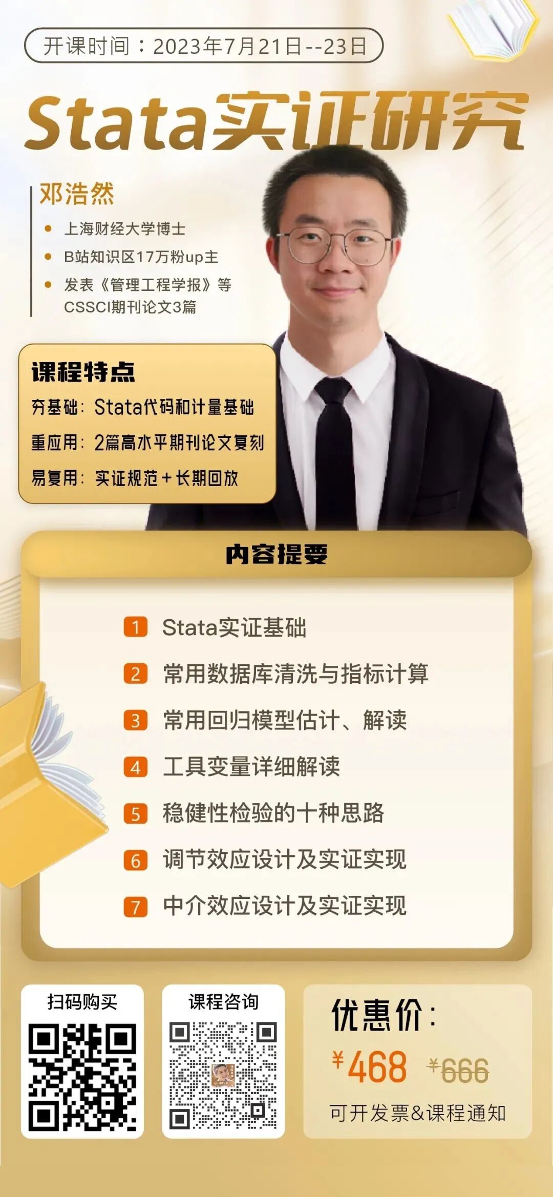 1.实证研究概述 2.顶刊上的实证研究方法大赏 3.Stata概述、菜单操作 4.Stata命令与帮助文件 5.Stata常见编码问题 6.国内常用数据库数据导入存储导出