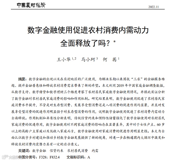 王小华,马小珂,何茜.数字金融使用促进农村消费内需动力全面释放了吗? [J].中国农村经济,2022(11):21-39.