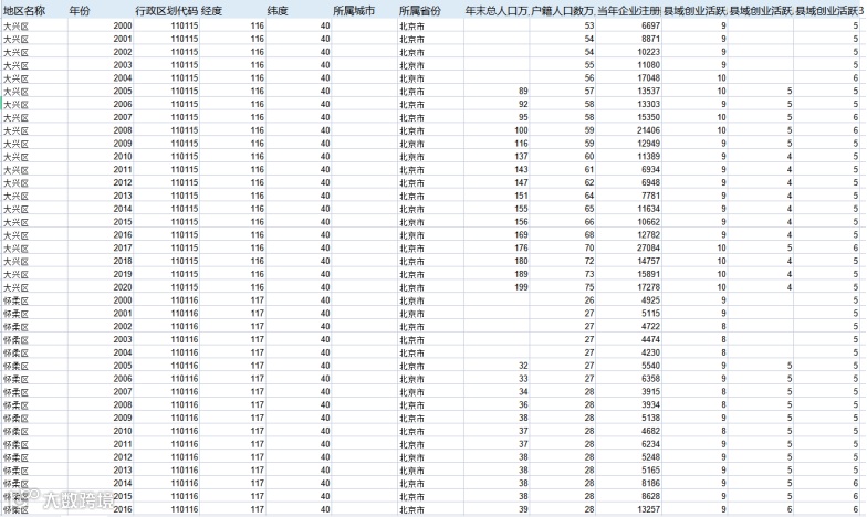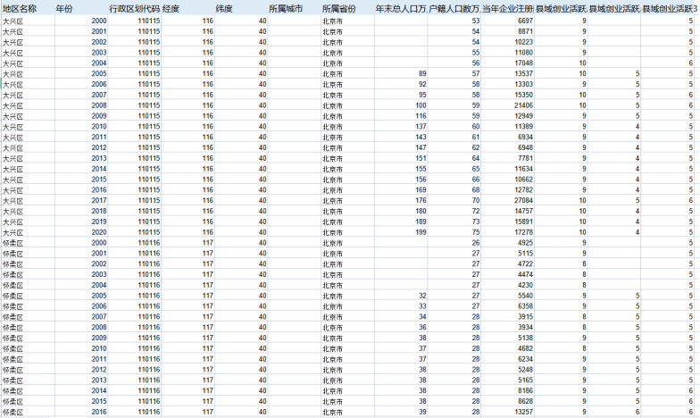 地区名称 年份 行政区划代码 经度 纬度 所属城市 所属省份 年末总人口万人 户籍人口数万人 当年企业注册数目 县域创业活跃度1 县域创业活跃度2 县域创业活跃3