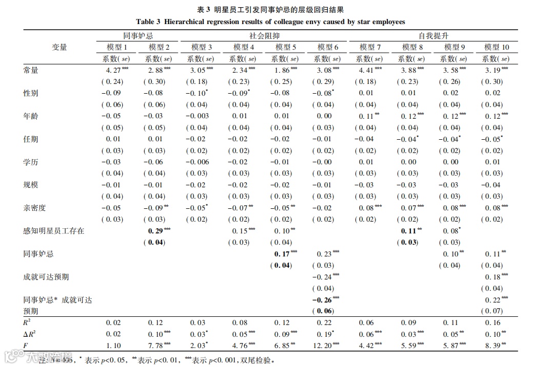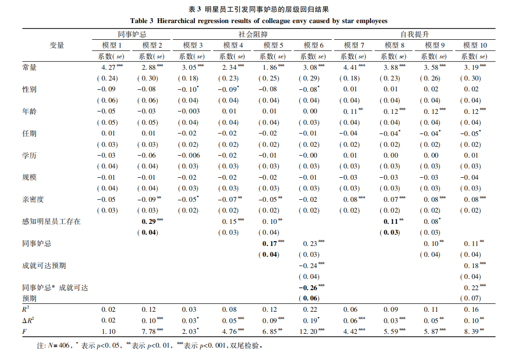 同样,模型8相比模型7整体拟合优度改进3%,感知明星员工存在对自我提升有显著的正向影响。模型9加入中介变量同事妒忌有增量意义,同时,同事妒忌对自我提升有显著的正向影响,而感知明星员工存在对社会阻抑的影响变小,由此H3成立。