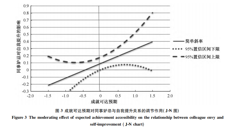 同理,模型10显示,同事妒忌与成就可达预期的交互项对自我提升有正向影响,说明调节效应存在。J-N图显示(见图3),成就可达预期(标准化)大于-0.16部分的简单斜率线的置信带排除了0,因而是显著的,并且该斜率线在0轴以上,表明同事妒忌对自我提升的积极影响随着成就可达预期的提高,越来越强。由此,假设H5a成立。