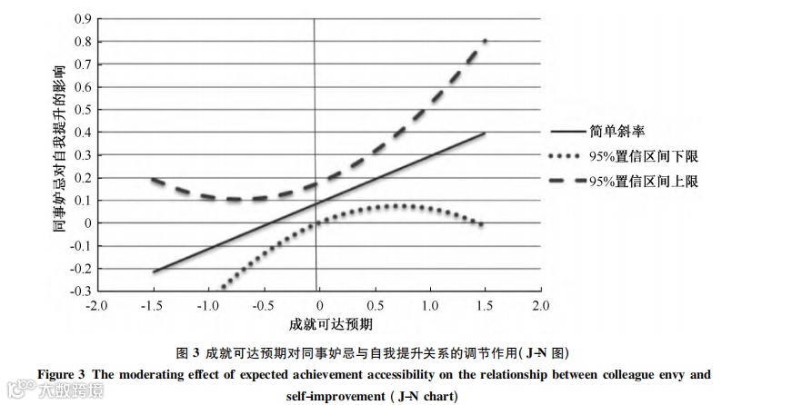 如图2所示,在成就可达预期(标准化)小于0.49部分,简单斜率线的置信带排除了0,因而是显著的,并且该斜率线在0轴以上,表明同事妒忌对社会阻抑的影响随着成就可达预期的提高,越来越弱,由此,假设H4a成立