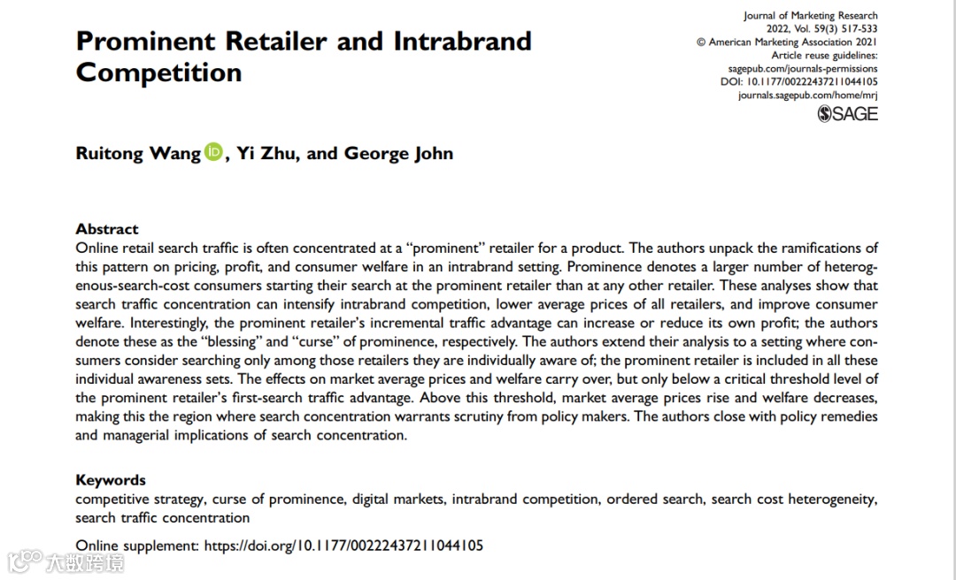 同济大学经济与管理学院助理教授王睿通合作文章“Prominent Retailer and Intra-brand Competition”(知名零售平台与品牌内部竞争)在国际顶级学术期刊Journal of Marketing Research正式发表。系首篇探讨搜索流量聚集对市场影响的理论文章,为流量垄断后果的探讨提供理论基础。
