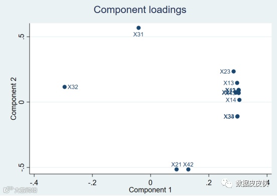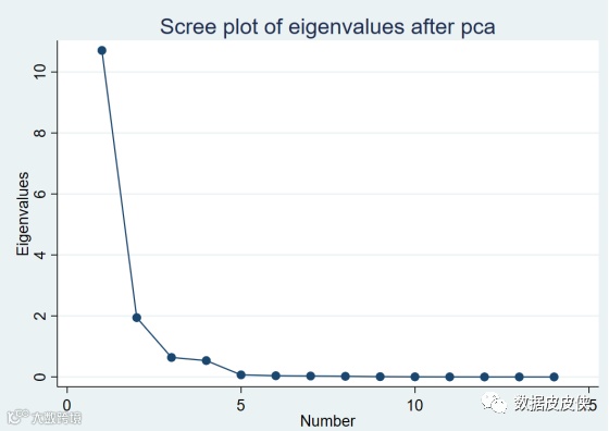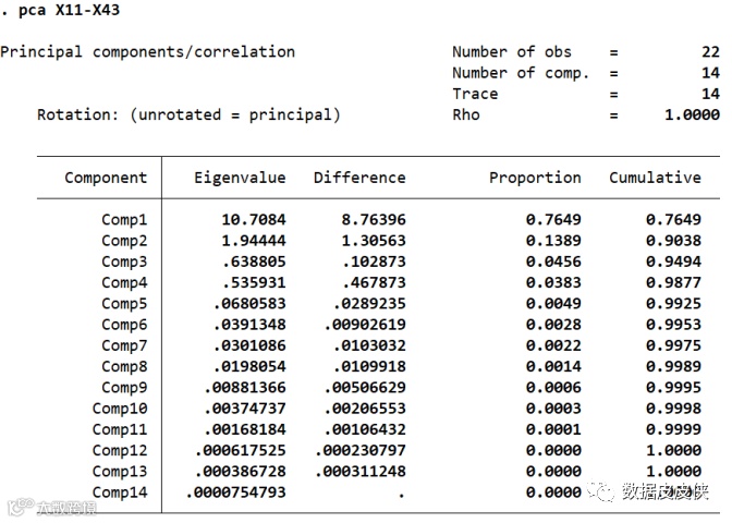 结果可以发现,stata总共提取了14个主成分。可以发现第一个主成分的方差贡献率是0.7649,表示该主成分解释了所有变量的76.49%的信息。