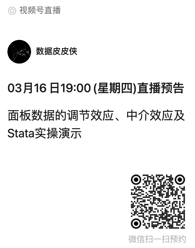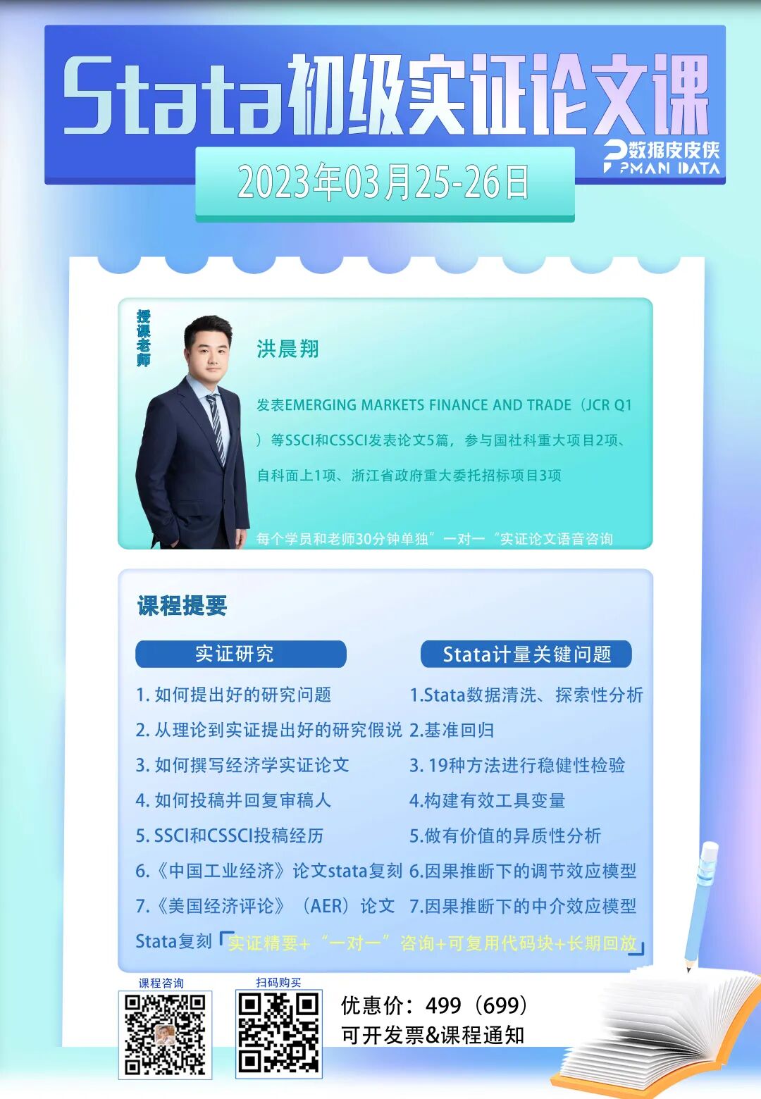 该老师近期在数据皮皮侠开设《Stata初级实证论文课》,课程给每位学员提供30分钟一对一咨询。洪晨翔,参与国家社会科学基金重大项目2项,国家自然科学基金面上项目1项,浙江省政府重大委托招标项目3项,作为主要完成人出版专著一本(中国社会科学出版社),在Emerging Markets Finance and Trade(JCR Q1)、《国际商务(对外经济贸易大学学报)》等SSCI和CSSCI发表论文5篇,《全球贸易投资便利化指数100强报告》被人民网、浙江日报等转载,撰写的3份研究报告获省部级领导的肯定性批示。