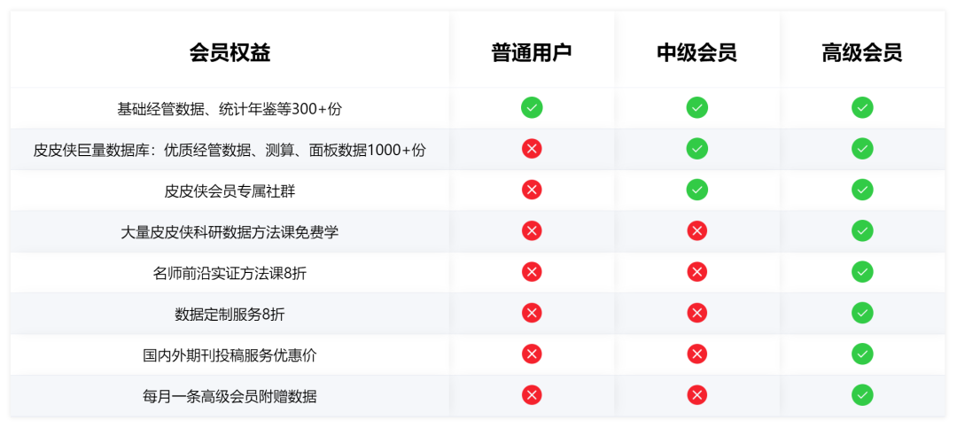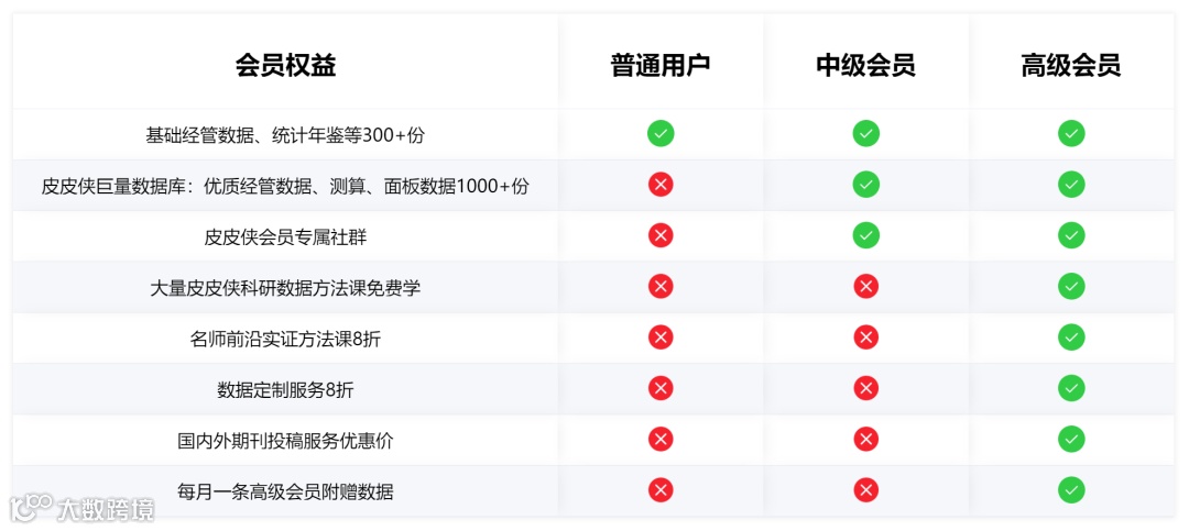 数据会员现有高级会员和中级会员两种,以下是权益对比: