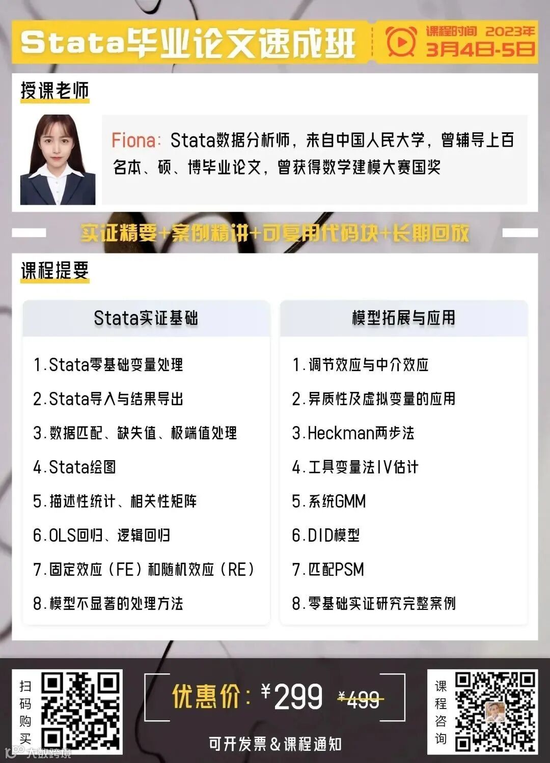 优惠二:集赞优惠,转发本推送到朋友圈2小时(不屏蔽)积赞20;或转发到100人以上年级群,并留言“很棒的因果推断课程”,享受9折优惠,可与优惠一叠加。