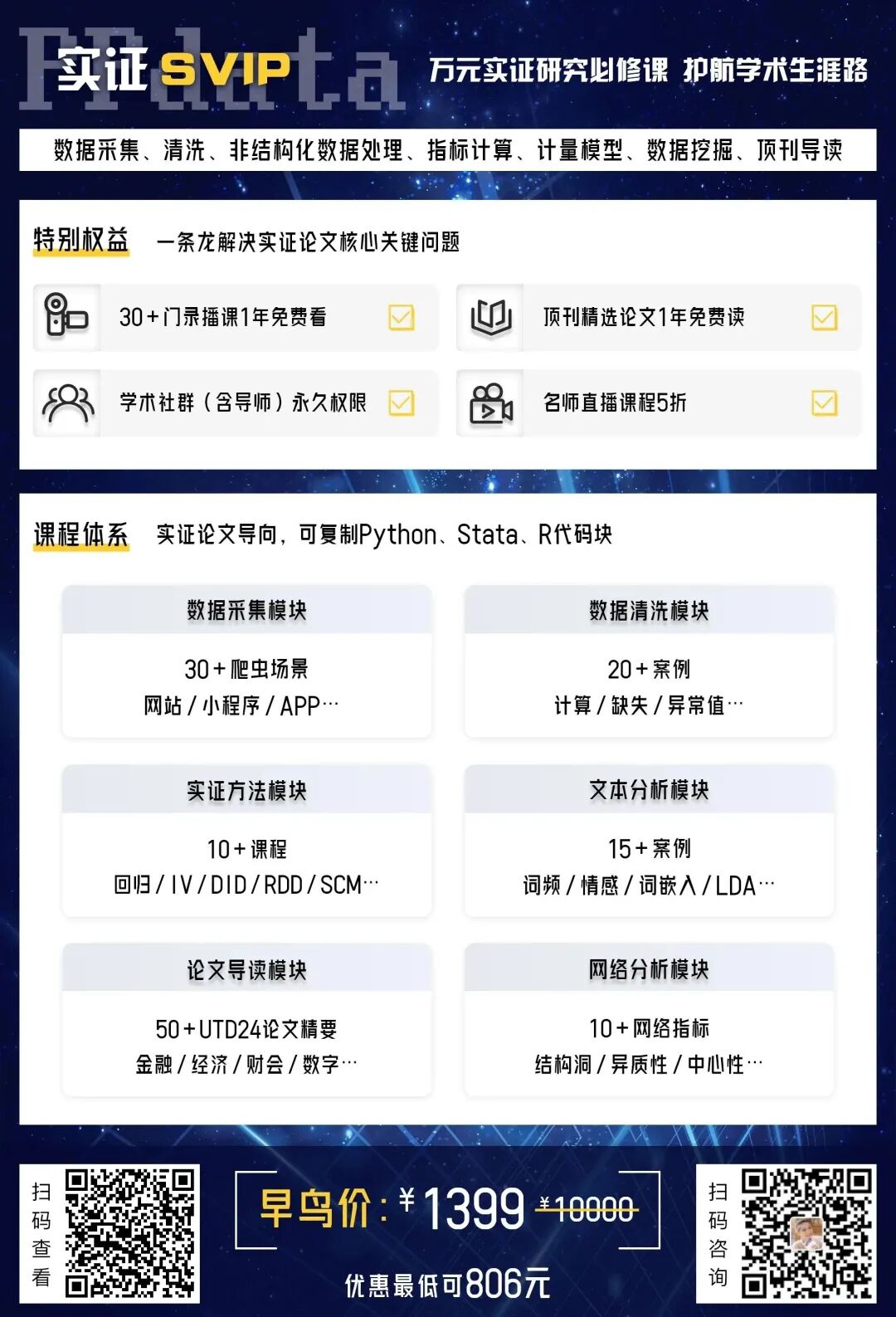 涵盖多源数据采集、数据清洗、基于非结构数据的指标构建、指标计算、模型构建、解读分析、顶刊导读,主打Python、Stata、R三种社科常用数据分析编程语言。