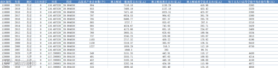 地方财政教育支出(亿元)、地方财政科学技术支出(亿元)、地方财政一般预算支出(亿元)、科学研究和技术服务业法人单位数(个)、规模以上工业企业R&D经费(万元)、研究与试验发展经费内部支出(万元)、研究与试验发展人员全时当量(人年)、研究与试验发展)经费投入强度(百分比)、高技术产业企业数(个)