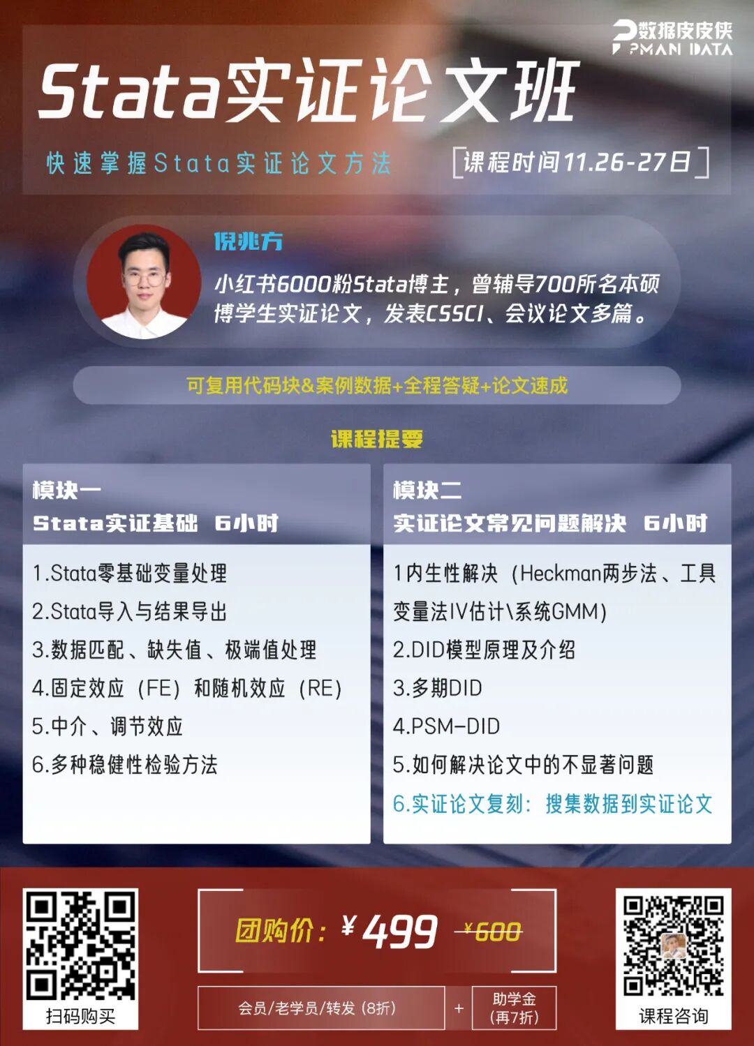 ——非会员转发本推送到朋友圈2小时(不屏蔽),或转发到100人以上年级群并留言“很棒的Stata实证论文课”