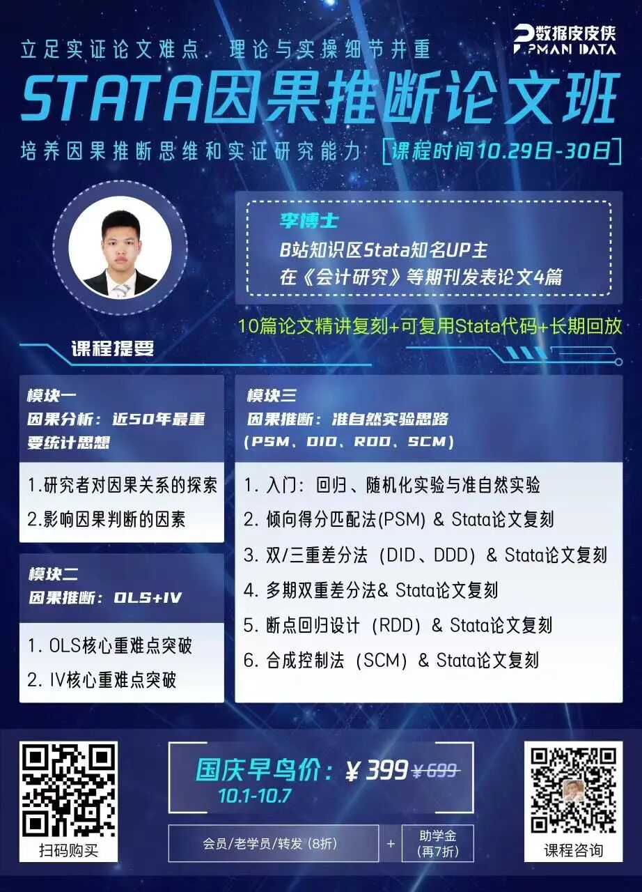 因果推断在最近50年得到了充分的发展,特别随着Angrist、Card以及Imbens获得诺奖,因果推断已成为实证论文不可或缺的一部分。本次课程着眼于如何快速复现、掌握常见因果推断方法并在自己的论文中使用,精心选取会计学、金融学、经济学、社会学等经管人文社科的10余篇论文进行精讲,涉及OLS+IV以及准自然实验思路(PSM、DID、RDD、SCM)两大版块,均提供理论讲解以及可供实操的Stata代码: