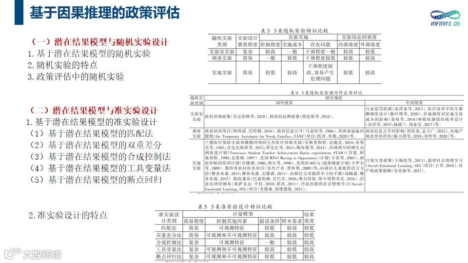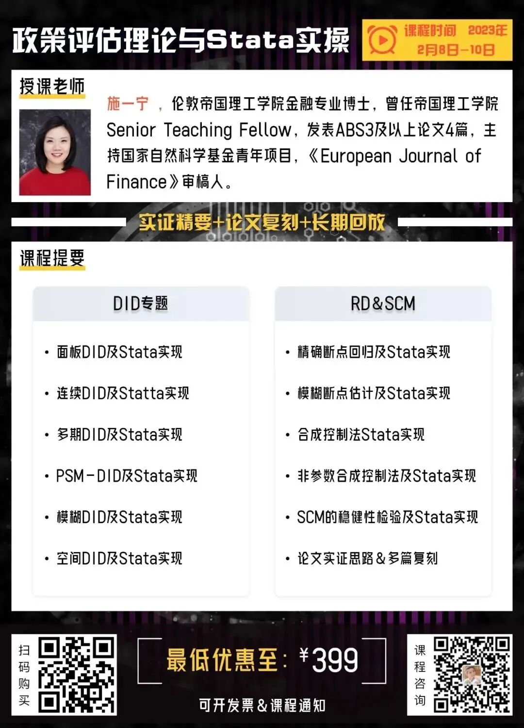 该文系统介绍因果推断了的政策评估应用,重点讨论因果推理的理论基础,即潜在结果模型、内部效度和外部效度理论、选择性偏差模型以及因果图等4种理论,并阐明不同因果推理理论的内在逻辑和一致性。同时,还基于潜在结果模型,提出一个实验和准实验设计的统一框架,并结合政策评估案例进行阐述。对于随机实验设计,重点讨论实验室实验、调查实验和实地实验。对于准实验设计,重点讨论匹配法、双重差分、合成控制、工具变量和断点回归。如果想要细致学习这些方法,可以选购社科学术汇开设的《Stata政策效应评估》(点击可查看)课程,明天即将开课!