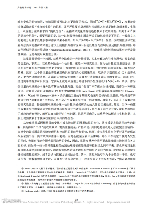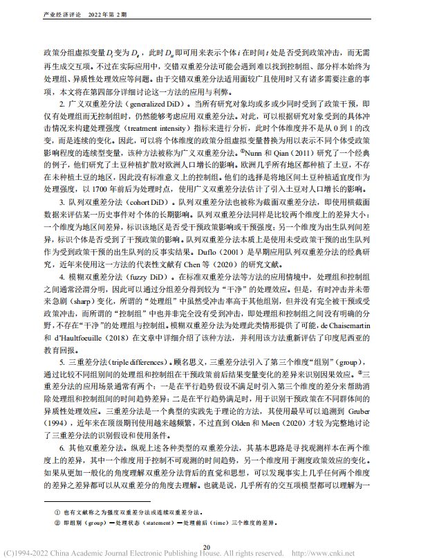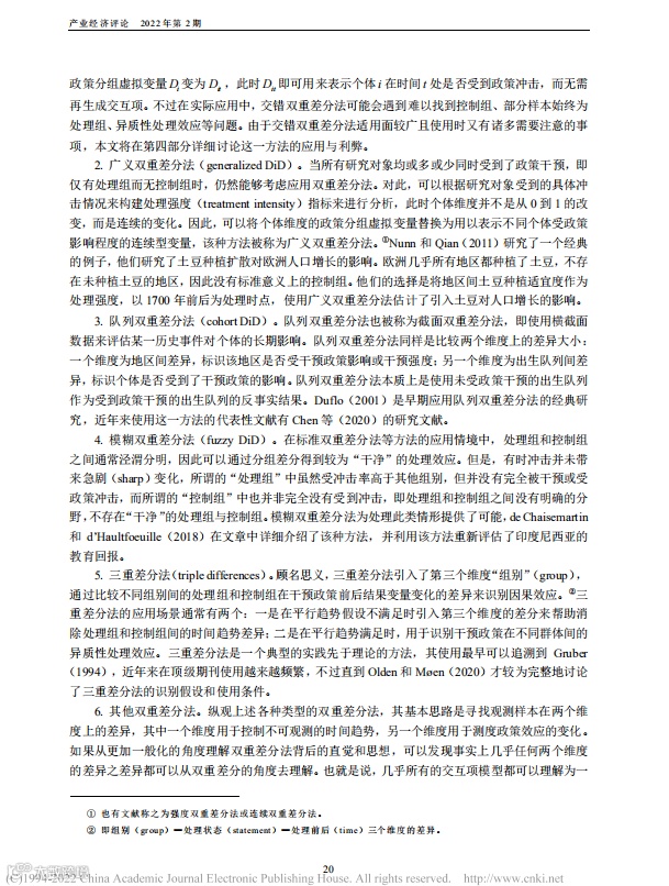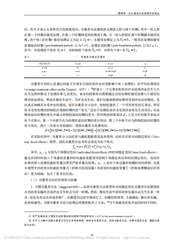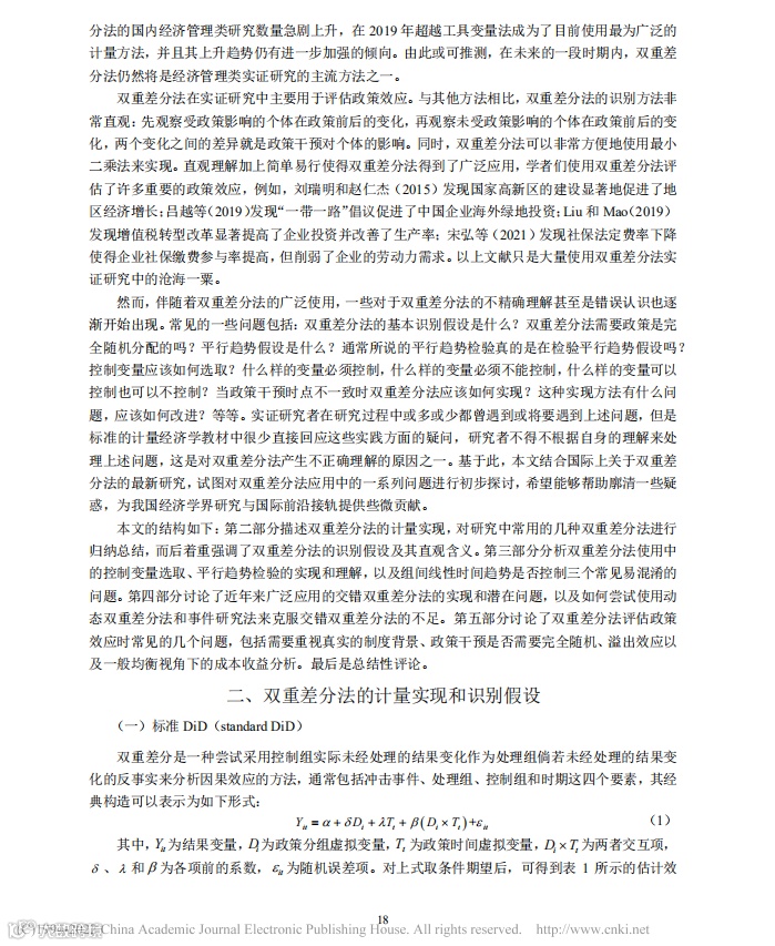 今天,推荐一篇综述性文章,由美国埃默里大学黄炜、中国人民大学财政金融学院张子尧、中国人民大学农业与农村发展学院刘安然在《产业经济评论》发表的期刊论文《从双重差分法到事件研究法》,里面对各种双重差分法做了细致的介绍,也对我国实证研究中滥用、误用双重差分法的问题进行了陈述,并对正确使用双重差分法给出了颇具建设性的意见。论文版权归原出版单位和作者所有,需要下载论文,“社科学术汇”公众号后台回复“产业经济评论”。